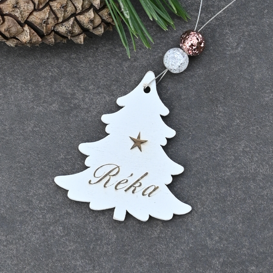 Egyedi névre szóló kedves ajándék. Fehér színű, fából készült fenyő ásvánnyal díszítve (hegyikristály – rose gold lávakő).