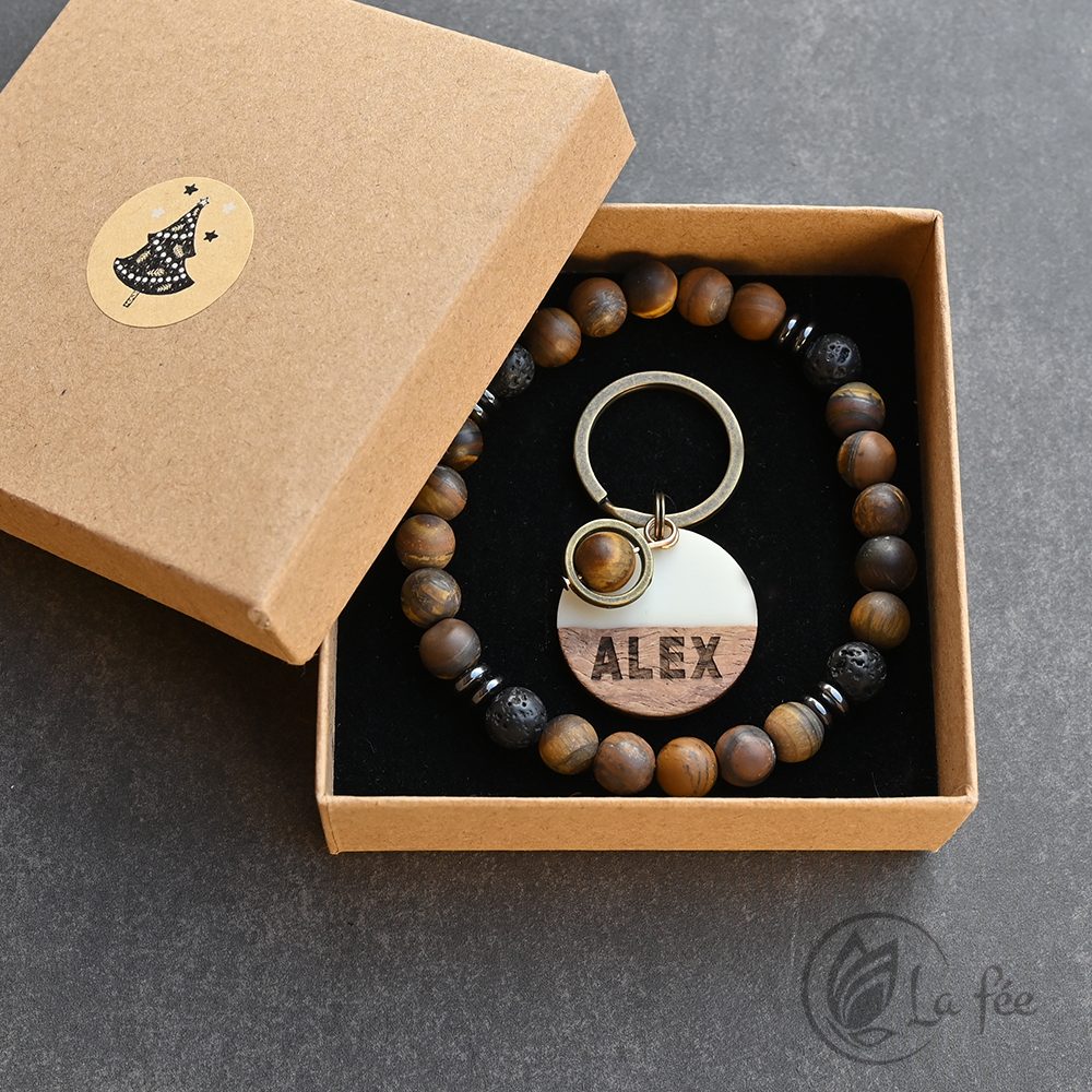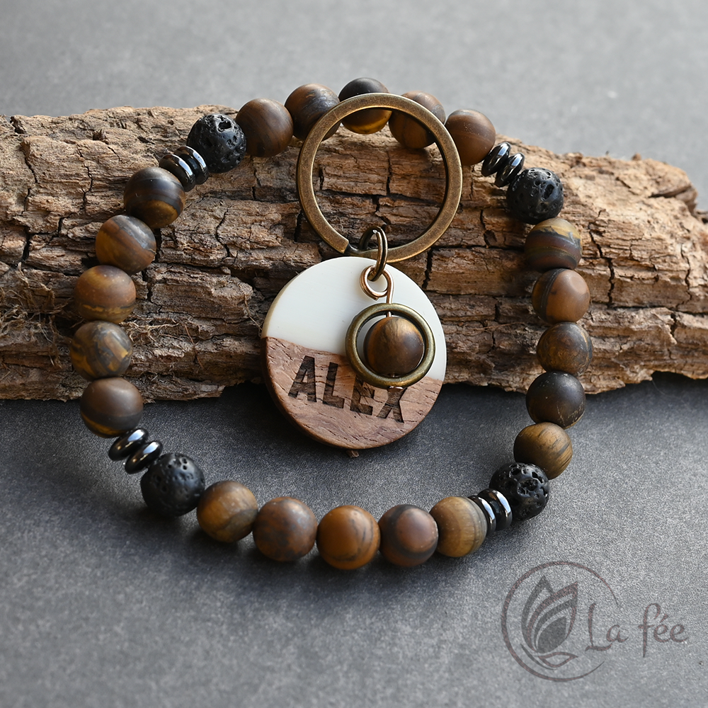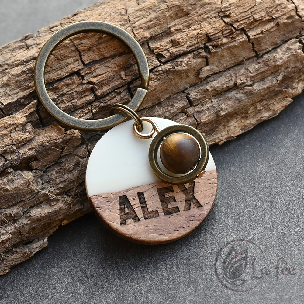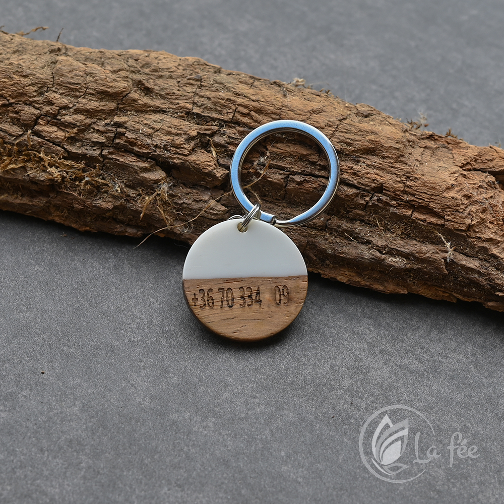 A kutyabiléta fából és gyantából készül szeretettel, ásvánnyal díszítve, hogy minél természet közelibb legyen.